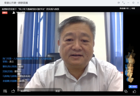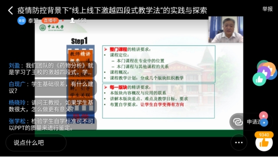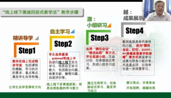 线上讲座中,王庭槐详细讲解了基于疫情防控背景下,开展“线上线下激越四段式教学法”的教学步骤: