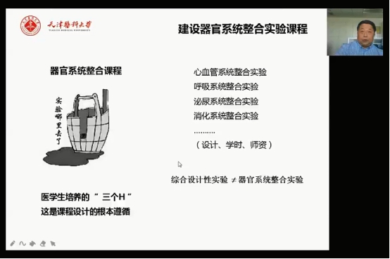 在讲座的后半场,康毅结合目前疫情的特殊情况,谈了几点对医学实验改革的思考:第一,通过对动物理论、科学精神、爱国主义、学校校史方面相结合教育,将思政教育融入实验教学;第二,正确理解3R——Reduction(减少)、Replacement(替代)、Refinement(优化),提高实验教学品质和动物质量;第三,综合利用实验动物,提高动物的品质和质量,提高实验教学效比;第四,依靠医学生培养的“三个H”——灵巧的手,机敏的头,仁慈的心,建设器官系统整合实验课程;第五,介绍机能实验新形态——以高质量动物实验为主,虚拟仿真实验其次,另外应该有人体生理实验,吸引学生以机能实验学为依托开展创新论坛暨实验设计大赛的项目。