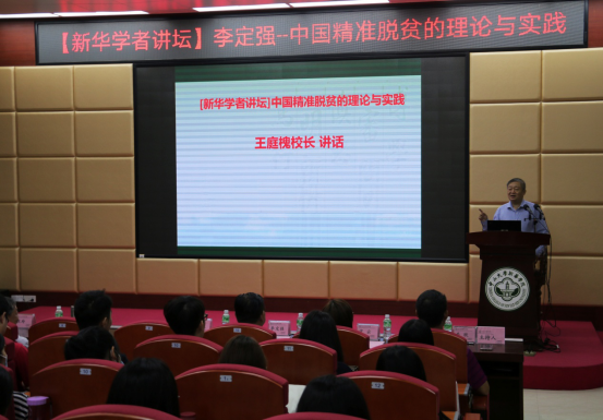 王庭槐校长代表学校对李定强副院长的到来表示欢迎。他讲到,中国共产党自成立之日起就以全心全意为人民服务为根本宗旨,贫穷不是社会主义,精准脱贫是中国共产党执政兴国的必然举措。党的十九大报告中指出“从现在到2020年,是全面建成小康社会决胜期”,精准脱贫是全面建成小康社会的刚性任务。我们的广大师生要积极投身这一伟大事业之中,为决胜全面建成小康社会作出应有的更大的贡献。