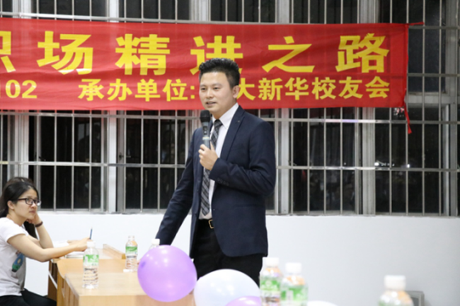 孙昊校友首先向师弟师妹们展示了自己在校及工作期间取得的一些成绩,他充实的四年大学生涯和丰富的实习就业经历让同学们惊叹不已。孙昊以他人生历程的时间轴和转型点为线索,向大家展示了从揭阳独自一人来到中大新华,适应、融入大学生活,身兼学生会文娱部长和艺术团团长等多个职务,参与了多项学生活动,以及坚持着见习和实习两份工作的同时,又需要熬夜学习、保持成绩的大学生涯。