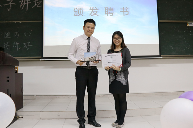 护理学院学生工作办公室李梦华副主任(右)向孙昊校友(左)颁发“荣誉讲师”聘书和纪念品