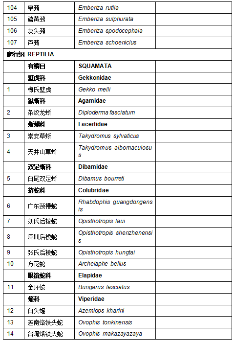 对广东省特有的两栖爬行类,如黑石顶角蟾、封开角蟾、东莞角蟾、广东颈槽蛇、深圳后棱蛇等,考虑到这些种类为近年新发现的物种,且分布区域狭窄,种群数量及濒危程度未作评估,故将其列入保护范围。