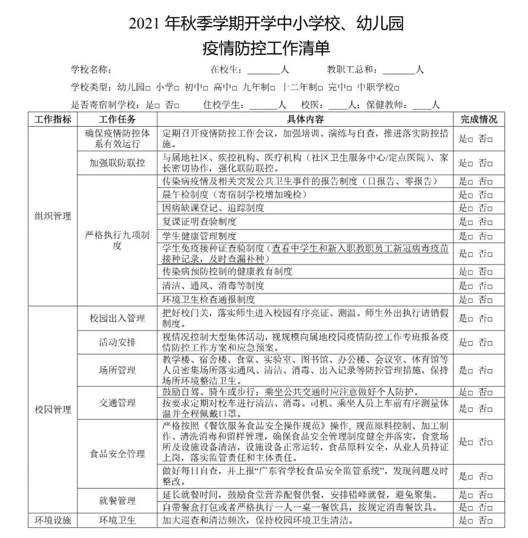 各级各类学校应对照《工作清单》,逐项落实疫情防控工作要求,及时查漏补缺,确保防控工作到位后方可开学。