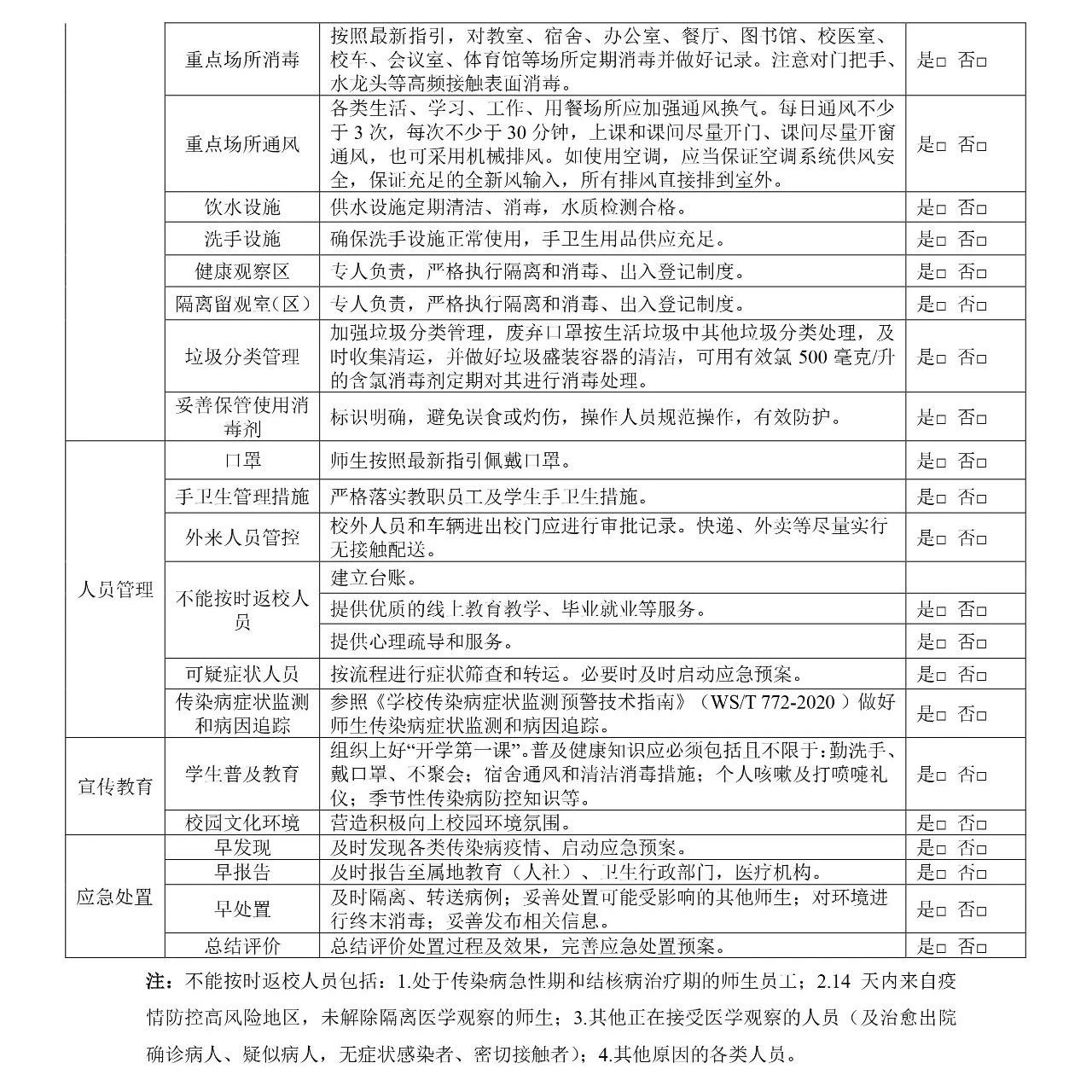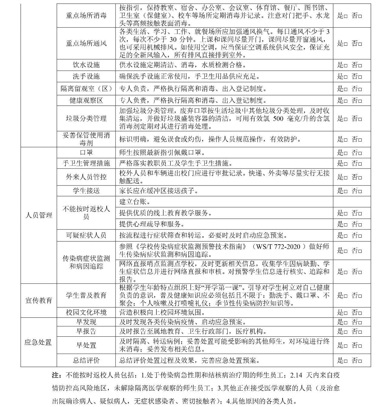 1.疫情防控的重点人员应暂缓返校,待所在地区降至低风险等级后或按防控要求健康管理后方可返校。疫情防控的重点人员包括开学时仍处于高风险地区所在县区、中风险地区、封闭封控管理地区,仍在境外的人员;14天内来自高风险地区未解除隔离医学观察(含居家健康监测)的人员;正在接受隔离医学观察(含居家健康监测)的疫情相关人员,及治愈出院确诊病人、无症状感染者、密切接触者和次密切接触者。