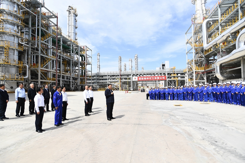 2021年9月13日至14日,中共中央总书记、国家主席、中央军委主席习近平在陕西省榆林市考察。这是13日上午,习近平在国家能源集团榆林化工有限公司考察时,同企业职工代表亲切交流。 新华社记者 燕雁/摄