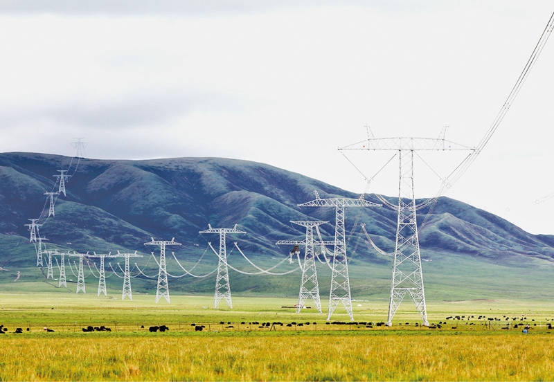 2020年7月15日,世界上首条主要输送风光新能源的青豫特高压开始输电。源自青藏高原的太阳能、风能等清洁电力,跨过崇山峻岭,源源不断直送中原大地。图为2021年6月17日在青海省黄南藏族自治州河南蒙古族自治县拍摄的青豫特高压直流工程。新华社发 谢莉蓉/摄