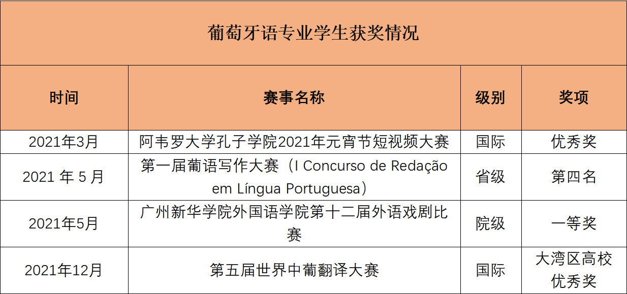 学生实习实践活动形式丰富,专业学生拥有丰富的葡萄牙语类专业竞赛机会,在国际翻译比赛、葡萄牙孔子学院活动、粤港澳大湾区高校联合比赛等活动中屡获佳绩。