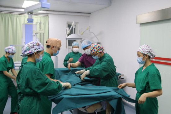 学生在模拟手术室学习如何为手术病人消毒铺巾