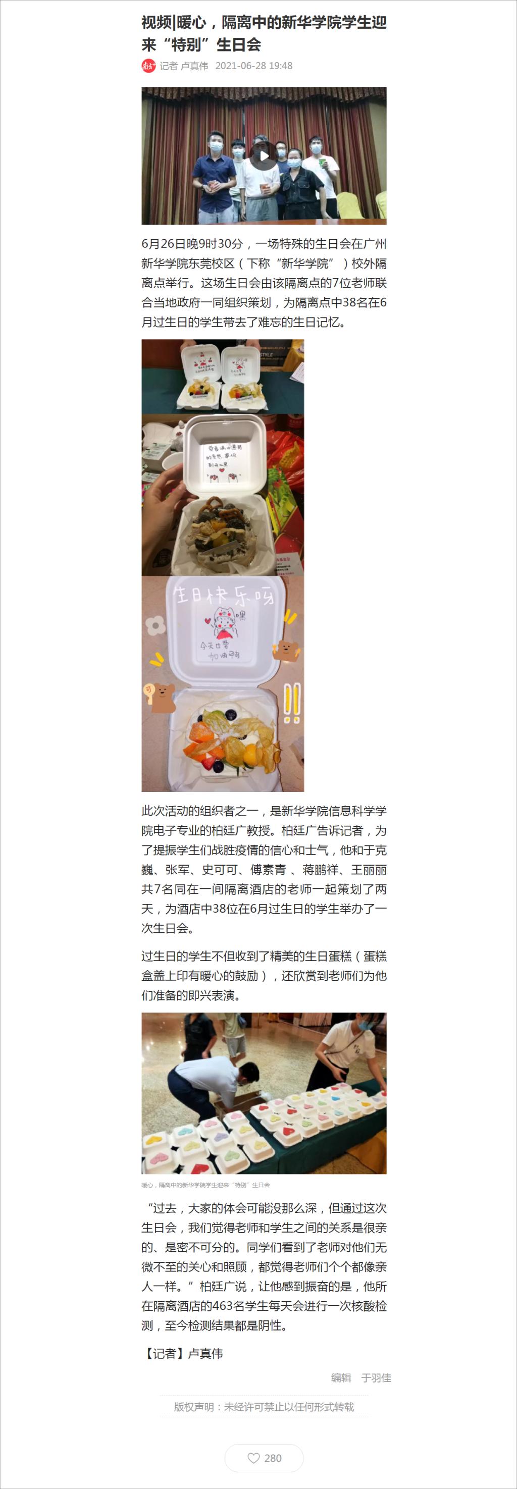 6月26日晚9时30分,一场特殊的生日会在suncitygroup太阳集团东莞校区(下称“新华学院”)校外隔离点举行。这场生日会由该隔离点的7位老师联合当地政府一同组织策划,为隔离点中38名在6月过生日的学生带去了难忘的生日记忆。