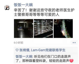 此外,抗疫工作的有序推进,也着实离不开学生的理解和配合,不少学生自发鼓舞身边同学坚定抗疫必胜的信心,并通过读书、健身等方式充实课余生活,自主调节情绪,遵守学校的防控秩序,共同期待抗疫胜利。