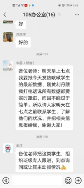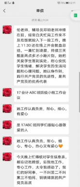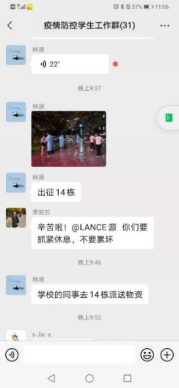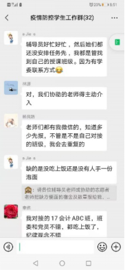 为分担抗疫一线老师的超负荷工作压力,校外老师纷纷加入战疫工作,一方面,主动筹备防护服、干粮等物资,为在校师生带去安全与保障;另一方面,有的老师积极响应号召,主动申请协助辅导员开展疫情期间的学生工作,包括对接各班的信息采集、跟踪及舆情反馈、情绪安抚等;有的老师主动请缨到校外隔离点陪护隔离的学生;有的老师积极发挥级导师作用,在线上开展主题班会、才艺分享会等,积极向学生传递正能量,帮助同学们化解对疫情的不安情绪。