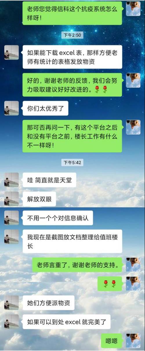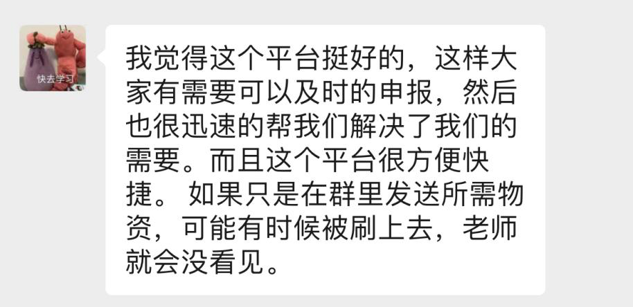 6月29日,一则《关于全面启用“suncitygroup太阳集团抗疫平台”的通知》在楼长群里发布,“suncitygroup太阳集团抗疫平台”正式投入使用。该平台主要用于学生每日健康汇报,以及申报日常所需。同学们只需在平台内完成信息登记,楼长直接可从后台获取信息并及时完成物资调配,极大程度地避免了信息遗漏,为楼长们换班后的登记信息交接工作提供便捷,为学生提供生活用品、药品和防疫物资畅通了新的便利渠道。