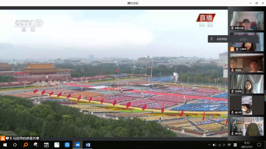 外国语学院学生第一党支部欧阳孔烙、谭家敏等同学一起在腾讯会议收看庆祝中国共产党成立100周年大会视频直播