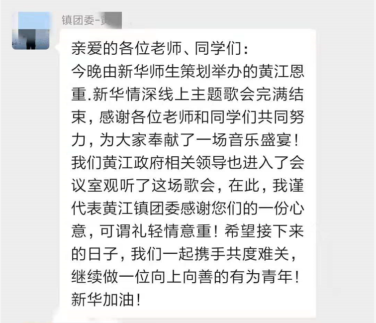 据悉,校外隔离点多次举办线上音乐会活动,丰富同学们的隔离生活。6月26日,经济与贸易学院举办“遇知音,齐欢唱” 线上歌曲欢唱活动,同学们在学校宿舍、校外隔离点共同唱响喜爱的歌曲;7月1日,校外某隔离点举办“黄江恩重新华情深”线上主题歌会,师生共享音乐魅力。此外,学校还组建了校外隔离点新华学子歌唱班,鼓励校外隔离点积极参与,以“音”抗疫,立志成长为德智体美劳全面发展的时代新人。