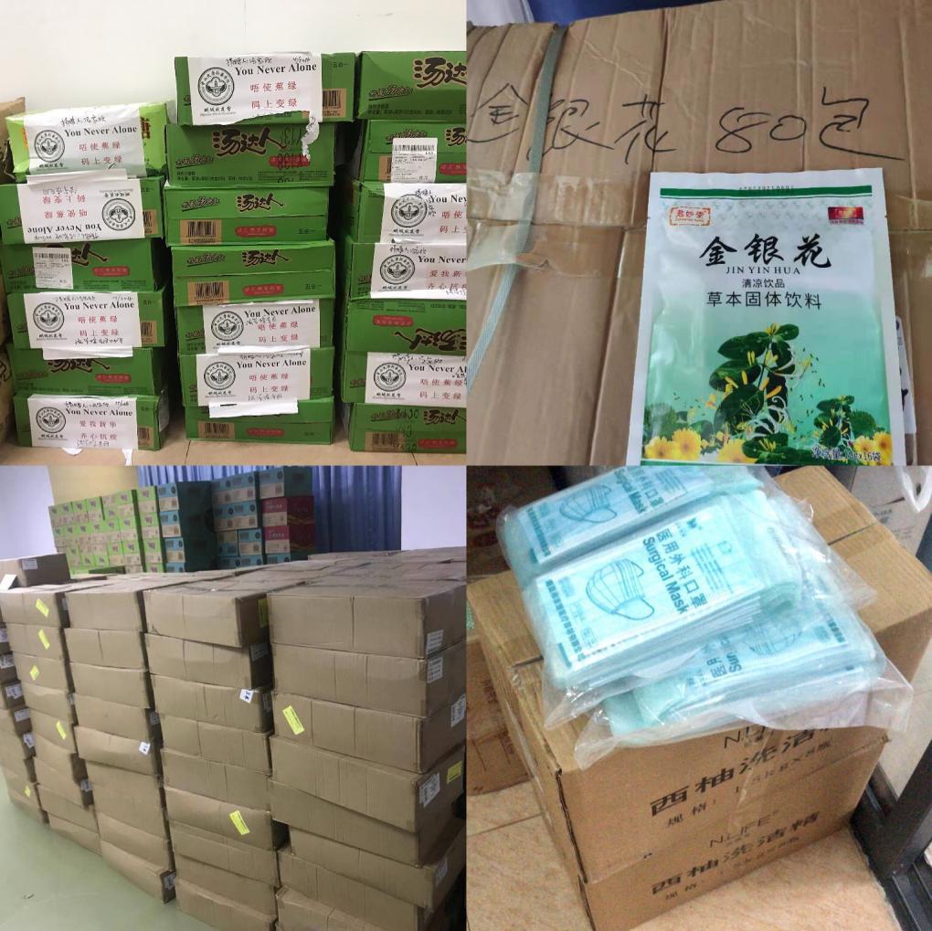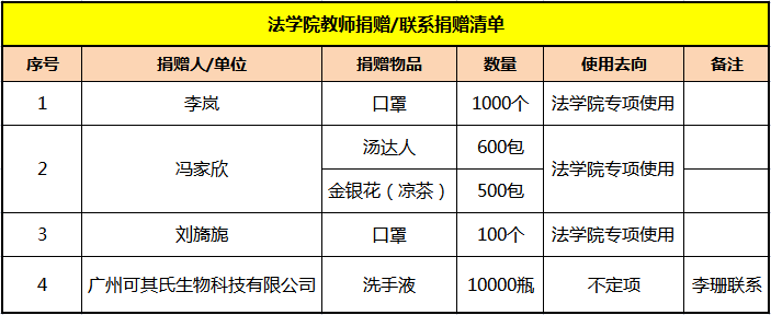 法学院院李岚、冯家欣、刘旖旎老师分别为学院学生捐赠一批抗疫物资,包括口罩、方便面、凉茶等。此外,李珊老师积极主动联系广州可其氏生物科技有限公司进行捐赠,经过多层的沟通联系,越过重重运输阻碍,及时地将一万瓶消毒洗手液运送到了学校。校外的廖诗颖、刘齐老师也时刻关怀着校内抗疫的老师和同学们,在接到允许返校通知时,立刻向在校师生了解需求,为因劳累导致肌肉损伤的老师们购置了膏药若干,为急需一般药物的学生购买非处方药若干。