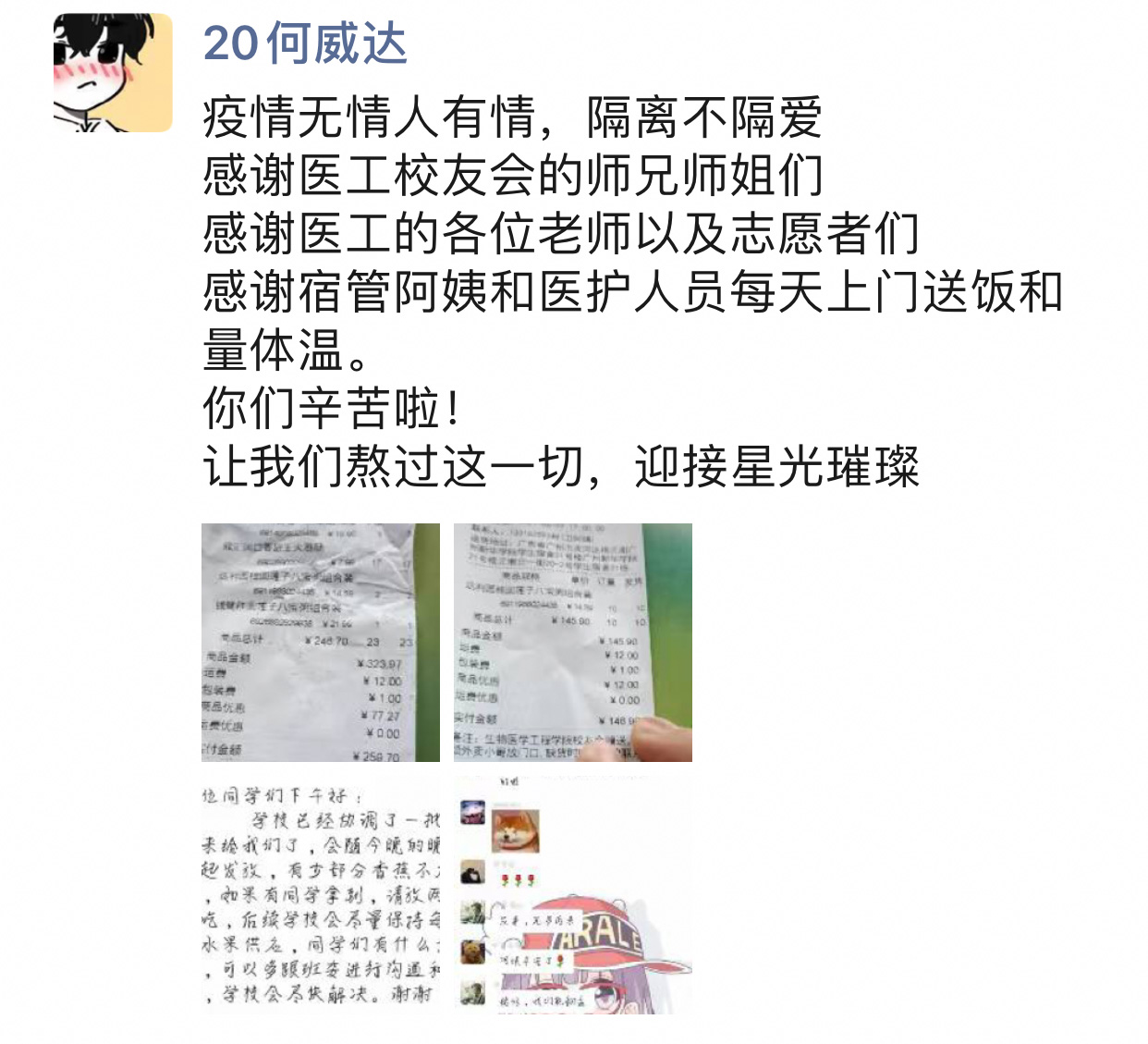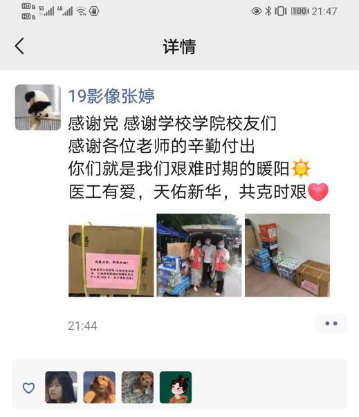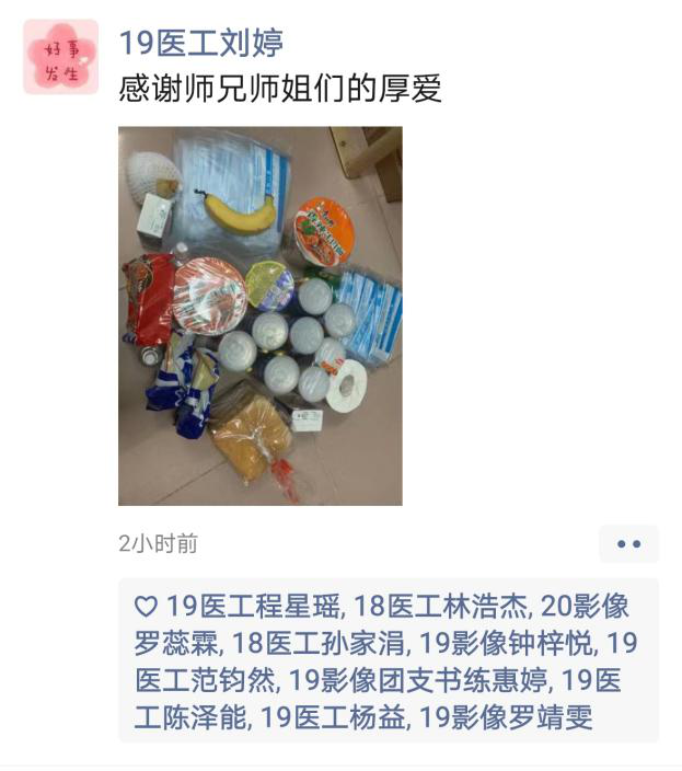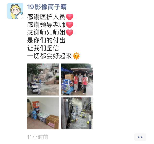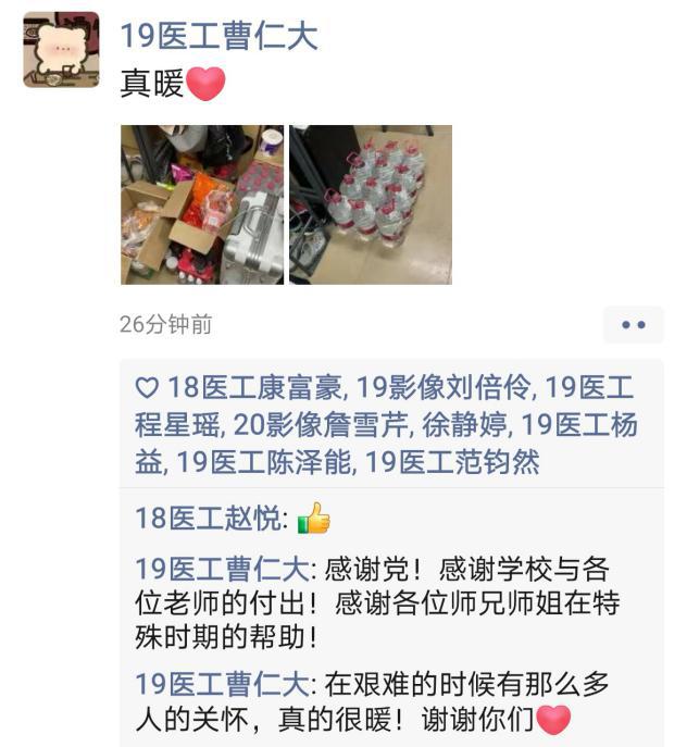 作为医工学子,当不忘医学生初心与使命,积极配合抗疫工作。在宿舍隔离期间,医工学子深刻感受到了党和国家政府、学校和学院帮助与关怀,并通过在宿舍门口张贴加油打气的画纸、在朋友圈发表感恩感激的言论、拍摄抗击疫情的短片等暖心的行为,向所有的医护人员和一线工作人员致敬。正如曹植所言:冀以尘雾之微,补益山海。荧烛末光,增辉日月。