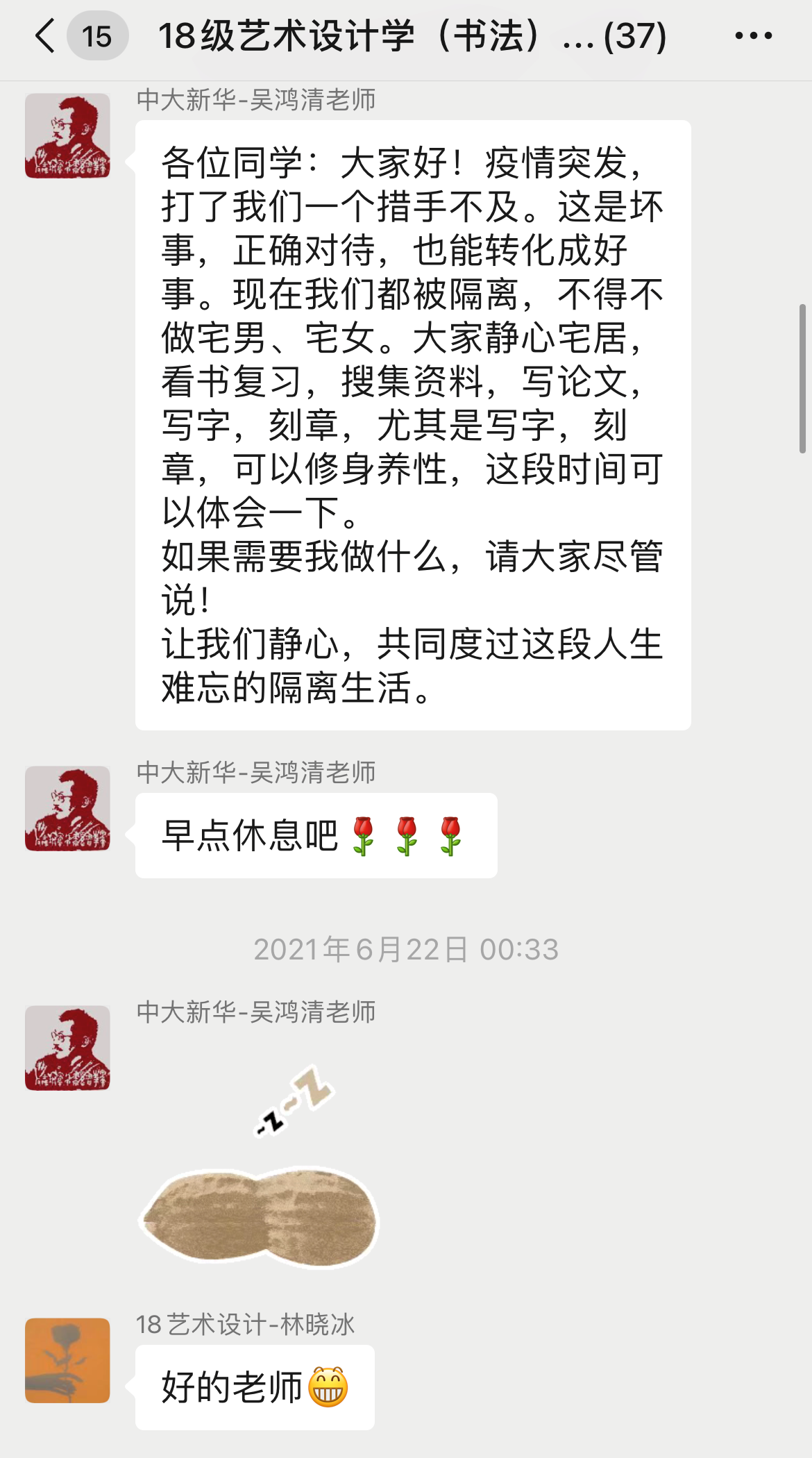 疫情期间,各小组严格落实上级部署的各项防疫工作安排,教师们及时向学生传达防疫相关文件精神,深入了解学生在学习、生活、心理等方面的问题并及时给予全方位的关心照顾。为缓解辅导员的工作压力,小组内各老师主动负责做到对每位同学完成健康状态追踪和每日健康情况打卡提醒等工作,大家为共同抗击疫情不断努力。
