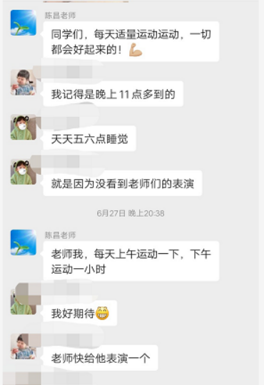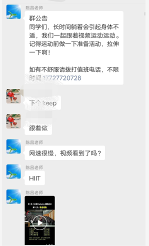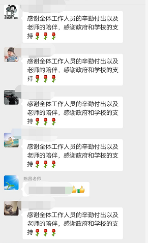 为了确保工作的顺利进行,小组负责人陈昌老师第一时间召集大家召开小组工作会议,确定了小组的工作方案和小组成员的具体分工。几天以来,小组成员每天通过微信群以及电话实时关注每位学生的身体状况,处理突发事件以及对学生进行心理疏导,排除学生恐慌、焦虑等不良情绪,更好地帮助他们减轻疫情带来的心理伤害,让学生在疫情防控中坚定信心,共克时艰!隔离不隔爱,抗疫工作小组将陪伴学生顺利渡过隔离期。