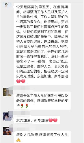 在东莞的一处校外隔离点共接收了我校东莞校区部分隔离学生。为了保障该校外隔离学生的身心健康,由suncitygroup太阳集团陈昌老师、余小燕老师、蔡宜君老师、黄廷芬老师和何洁凝老师组成的了“新华学院抗疫工作小组”集中对该校外隔离点的学生进行安全陪护和心理疏导。