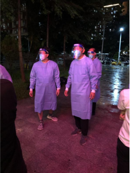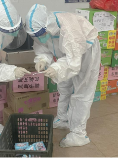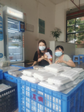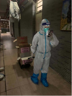 由于此次疫情发生突然,为保证全校师生日常三餐及基本生活物资的供应,学校号召在校教职工积极参与志愿送餐服务。外院教师积极响应,毅然地穿上了防护服,奔赴在了服务学生的第一线,努力保障学生们在隔离期间吃上热乎乎的饭菜。