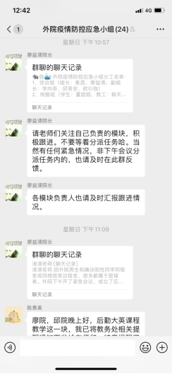 外国语学院于20日下午召开了教职工紧急会议,传达学校疫情防控领导小组关于疫情防控的工作部署。同时,针对学院防疫要求作出紧急部署,成立了外院疫情防控应急小组,明确各小组成员分配及各自分工,第一时间组织摸清院内在校教职工及家属63人,在校外籍教师3人,以及全部在校学生的健康状况。同时,学院安排了两位老师分别对隔离教职工和隔离学生进行24小时健康状况监控,确保师生信息采集全覆盖,确保信息报送及时准确。