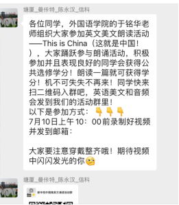 于铭华老师组织酒店隔离学生积极参加英文诵读活动