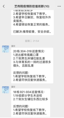 为了保证封闭期间学生学习、生活有序进行,及时掌握并了解同学们现状与需求,学院领导、辅导员、班主任和党团学干部共55人成立巡查小组,实行全程、全方位、全覆盖值班制度,深入186间学生宿舍,705名在校生,不漏一间宿舍,不漏一人,主动联系学生,关怀学生学习生活上的情况,了解学生难处并及时提供帮助。在走访期间,积极听取同学们反馈关于在疫情封闭管理期间的学习、生活问题。值班小组针对相关问题进行详细记录,主动安抚学生情绪,鼓励克服当前困难,并把有关问题积极向上级反馈。除此以外,学院还高度重视心理问题学生及经济困难学生。