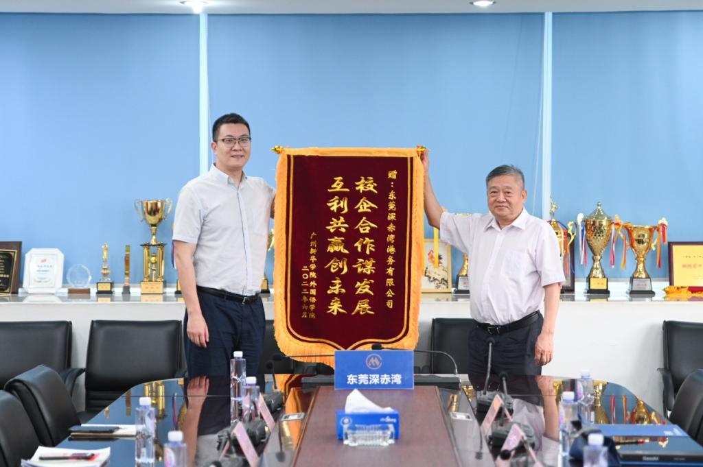 座谈会后,王庭槐感谢东莞深赤湾一直以来对我校应用型人才培养的贡献,向东莞深赤湾授予锦旗,并进行实习基地挂牌仪式。